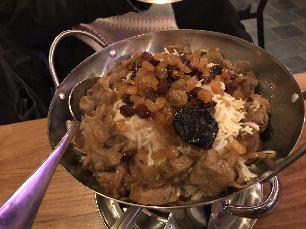 ゴロゴロと入っている羊肉と一緒にデーツやレーズンなどのドライフルーツが調理されている、贅沢な一品です。