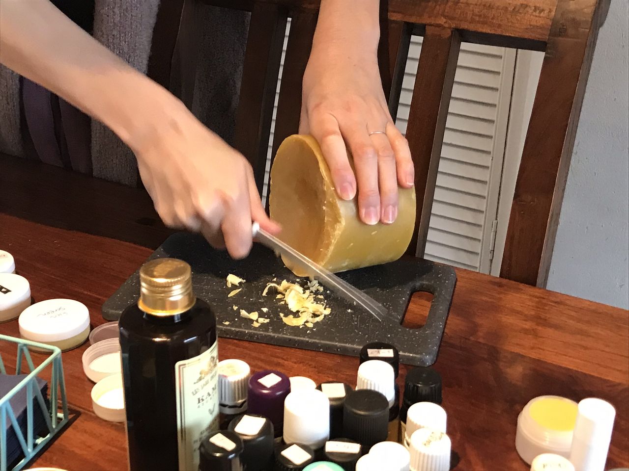 ヒトミさん秘蔵の、地元の養蜂協会から仕入れたという蜜蝋を削ります。