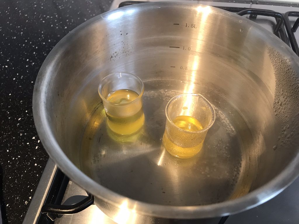 その蜜蝋フレークと、植物オイルをミックスし、湯せん。